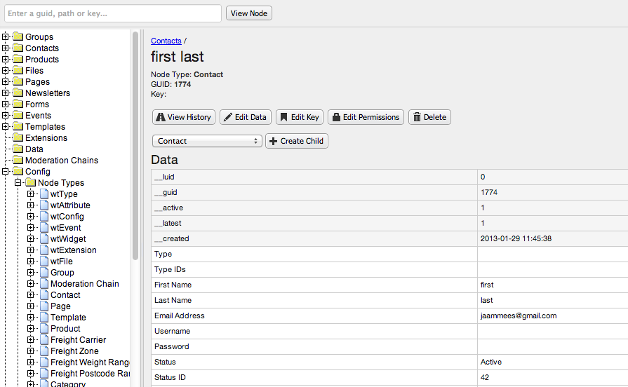 A database for a WebTemplate website has the structure of a tree. Each node in the tree is of a certain Node Type. The Node Type defines which attributes can be stored for the node. eg, a node of type "Contact" can typically store the attributes "First Name", "Last Name", "Email Address".