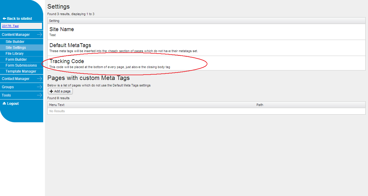 To add a tracking script such as the Google Analytics tracking script, go the Content Manager -> Site Settings and click on ‘Tracking Code’. You can then paste in the tracking code into the box provided. The tracking code will be placed just above the </body> tag for every page on the site.