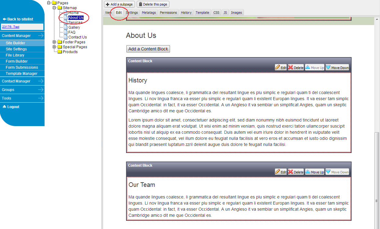 Once viewing a website, to edit content go to Content Manager->Site Builder. Site Builder will display a map of the site and the content for the currently selected page. Select the page to edit either by selecting the page in the tree in the left or by using the website’s menu and then click on the ‘Edit’ tab. Content editing boxes will appear around content which can be edited.